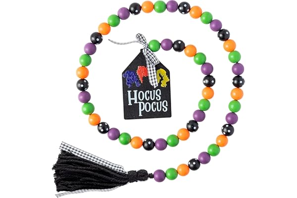 Halloween Hocus Pocus Wood Bead Garland 41.3 inches Wood Bead Garland with Jute Rope Plaid Tassel Hocus Pocus Tag Farmhouse Wood Beads Natural Fall String Hanging Décor for Nursery Room