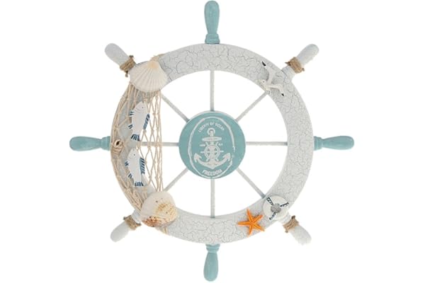 Rienar Nautical Beach Wooden Boat Ship Steering Wheel Fishing Net Shell Home Wall Decor White
