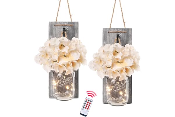 Rustic Wall Sconces Mason Jar Sconces Handmade Wall Art Hanging Design with Remote Control LED Fairy Lights and White Peony