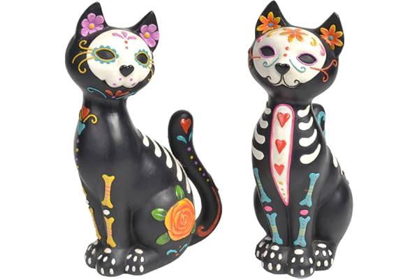 Day-of Dead-Figurines Floral Cats Couple-Decor Dia de Los Muertos Black Kitten Collectibles Set of 2, 6.3L x 4.0W x 10.2H inch