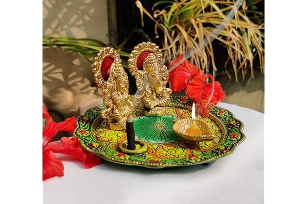 Wonder Care Aluminum Gold Color Plated Laxmi Ganesha Idol with Platter Plate for Puja Diwali Gift Items Deepawali Decorations Indian Dhanteras Pooja Statue Thali