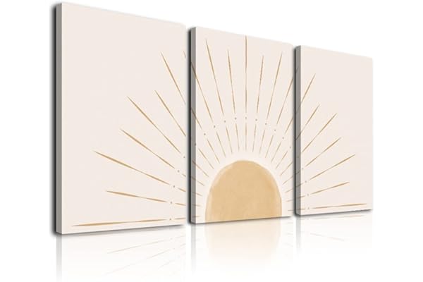 Framed Canvas Wall Art Yellow Sun Rising on the Horizon Geometric Nature Illustrations Line Art Wall, Mid-Century Modern Prints Boho Sun Wall Decor for Living Room, Bedroom, Bathroom, Office, 12"x16" Natural