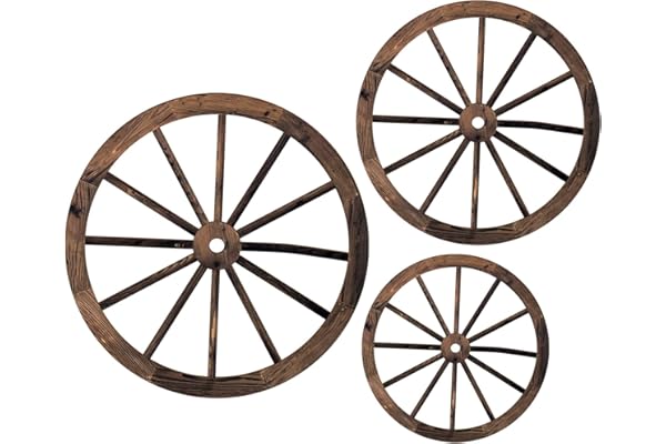 3 Pcs Wooden Wagon Wheel Wall Decor 12/10/8 Inch Old Western Wood Wagon Wheel Wall Art Farmhouse Wagon Wheels Rustic Yard Decor Wood Hanging Decorative Wheels for Garden Home Bar Garage (Dark Brown)