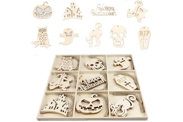 BIZHUDP 36 Pieces Halloween Wooden Slices Blank Hanging Tags Hanging Wood Ornaments Halloween Cutouts Crafts with 36 Pieces Twine Ropes for Halloween Ornaments Supplies