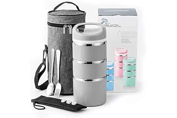 3-Tier Insulated Bento/Food Container with Upgraded Lunch Bag, Portable Cutlery Set and 3 Extra Silicone Seals, 43 OZ, Gray
