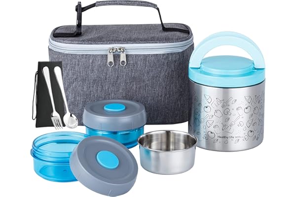 An Vacuum Insulated Bento/Snack Box Keeping Food Warm for 4-6 Hours, Two BPA-Free Food Containers, A Lunch Bag, A Portable Cutlery Set, Smart Diet, Weight Control (Blue)
