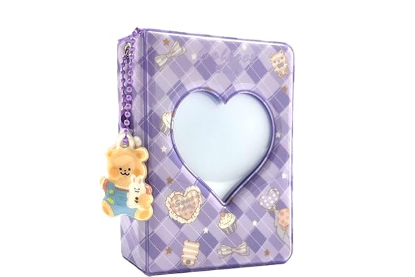 Heart Hollow Card Binder Photo Album Kpop Photo Card Holder with Pendant 40 Pockets (purple plaid)