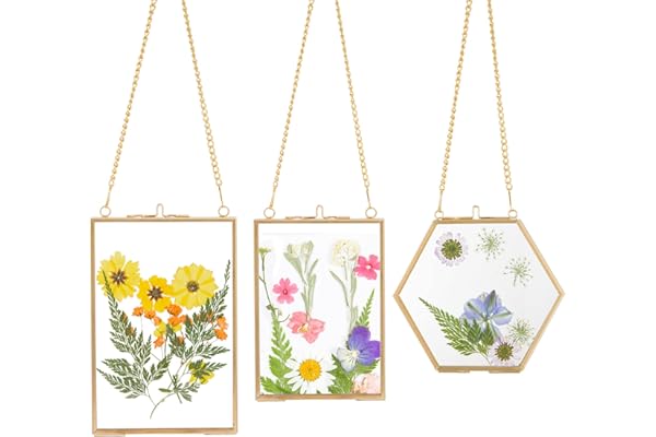 3 Packs Pressed Flowers Glass Frames- Golden Hanging Glass Picture Frames with Chain Floating DIY Artwork Display Frames in 3 Sizes for Dried Plant Specimen Kids Art Photo Display Gallery Wall Decor