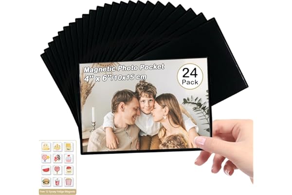 Holds 4X6 Inches Pictures, Reusable Black Magnet Fridge Photo Sleeves with for Refrigerator, Locker,Office Cabinet with Free Removable 12 Pcs Food Fridge Magnet