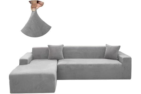 Arfntevss Velvet Sectional Couch Covers L Shape Sofa Cover for Dogs Stretch Soft 2 Pieces L-Shaped Sofa Slipcovers Set for Living Room Non Slip Pet Friendly Furniture Protector (Light Gray, Large)