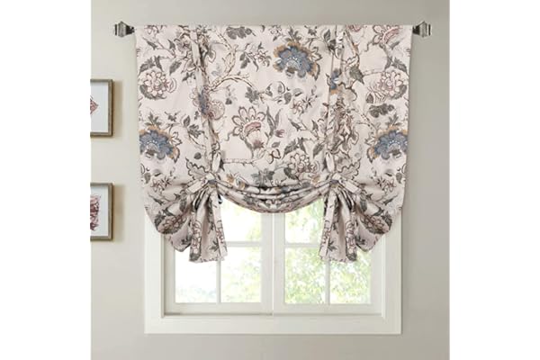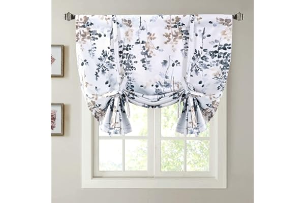 Thermal Insulated Balloon Curtain for Small Window Adjustable Kitchen Tie Up Curtain (Floral Pattern in Bluestone and Taupe, Rod Pocket Panel, 42 inches W x 63 inches L)