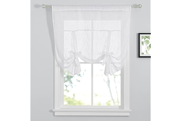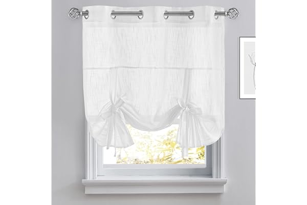 Short Curtains Rod Pocket Top Tie Up Shade Linen Look Semi Sheer Decoration for Kitchen Bedroom, 42" x 45", White, 1 PC