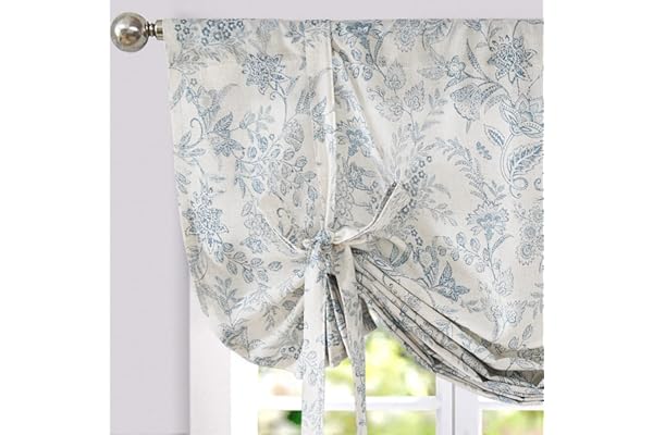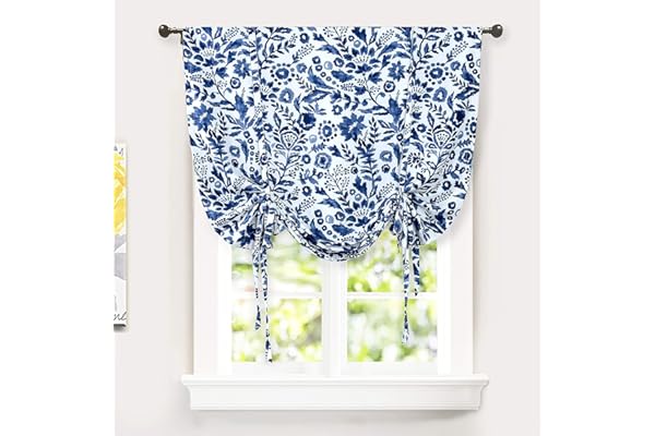 JINCHAN Tie Up Shade Valance Curtains Floral Valance for Windows Adjustable Balloon Shade Valance Window Treatments Tie-up Shade Valance for Living Room 45 Inches Rod Pocket 1 Panel Blue on Beige
