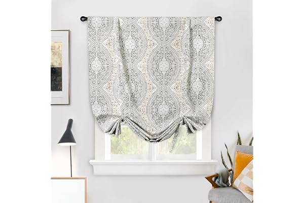DriftAway Adrianne Tie Up Curtain Damask Floral Pattern Thermal Insulated Room Darkening Window Adjustable Balloon Curtain Shade for Small Window Rod Pocket Single 39 Inch by 55 Inch Beige and Gray