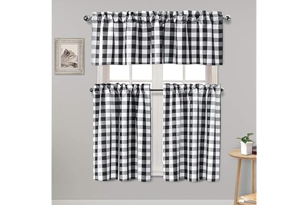 Hiasan 3 Piece Semi Sheer Black Kitchen Curtains Light Filtering Buffalo Checkered Tier and Valance Window Curtains Set