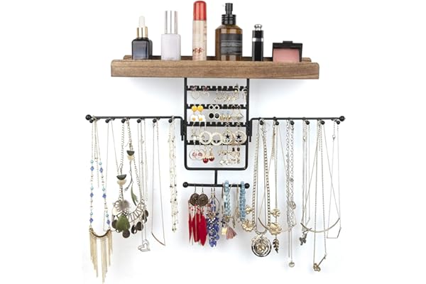 SOLIMINTR Hanging Jewelry Organizer Wall Mount Jewelry Holder with Rustic Wood Shelf