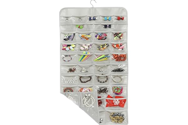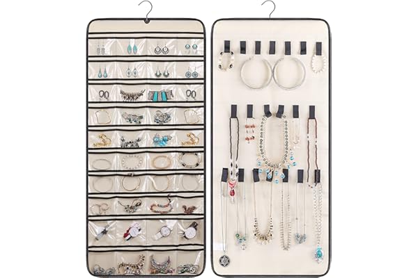 MISSLO Dual-sided Hanging Jewelry Organizer with 40 Pockets and 20 Hook & Loops Closet Necklace Holder for Earring Bracelet Ring Chain with Rotating Hanger