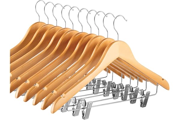 HOUSE DAY 12 Pack High-Grade Wooden Suit Hangers Skirt Hangers with Clips Solid Wood Pants Hangers Natural Smooth Finish Premium Wood Hangers with Durable Metal Clips for Blouse