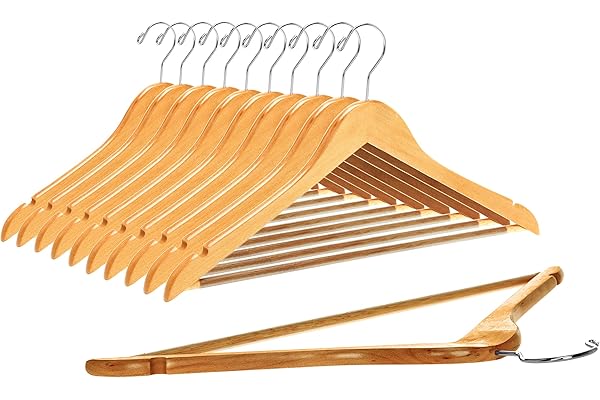 Slightly Curved Hanger Set - Solid Wood Coat Hangers with Stylish Chrome Hooks - Heavy-Duty Clothes, Jacket, Shirt, Pants, Suit Hangers (Natural, 10)