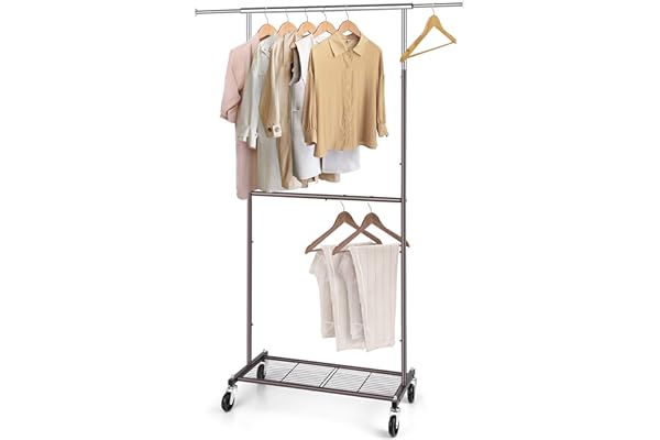 Rolling Clothes Organizer with Wheels and Bottom Shelves, Extendable, Bronze