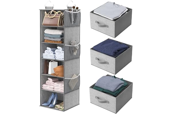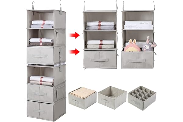 Hanging Shelves for Closet with 3 Divisible Drawers & Side Pocket, Linen, 11.4''W x 12''D x 43.3''H, Grey