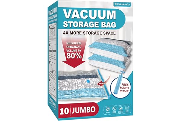 Space Saver Bags (4 Jumbo/4 Large/4 Medium/4 Small/4 Roll) Compression Storage Bags for Comforters and Blankets, Vacuum Sealer Bags for Clothes Storage, Hand Pump Included