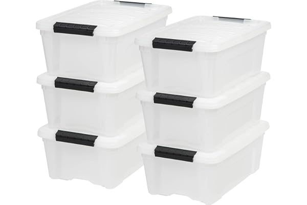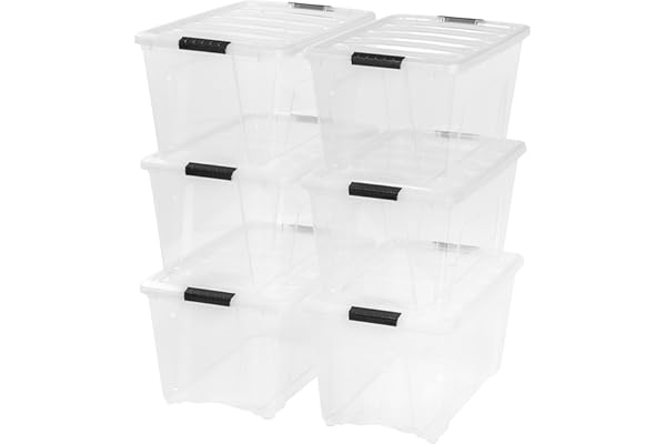 Plastic Storage Bin Tote Organizing Container with Durable Lid and Secure Latching Buckles, Stackable and Nestable, 6 Pack, clear with Black Buckle