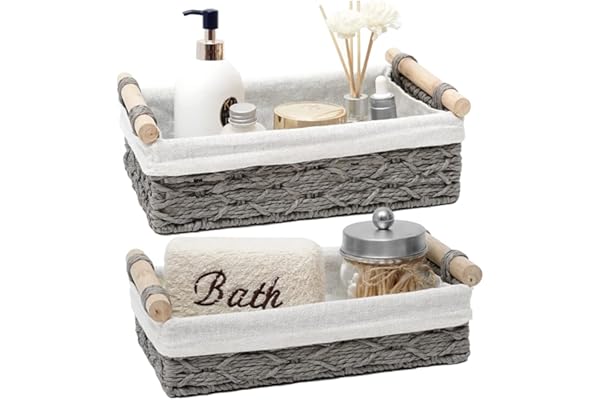 DUOER Round Paper Rope Storage Basket Wicker Baskets for Organizing with Handle Decorative Storage Bins for Countertop Toilet Paper Basket for Toilet Tank Top Small Baskets Set (Set of 2,Grey)