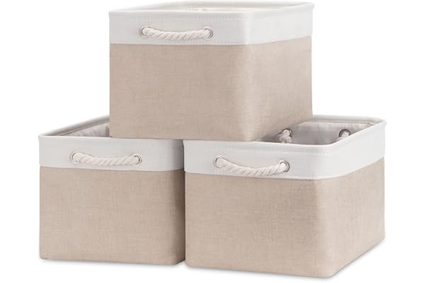 Collapsible Fabric Bins for Shelves, Closets, Nursery (White & Khaki)
