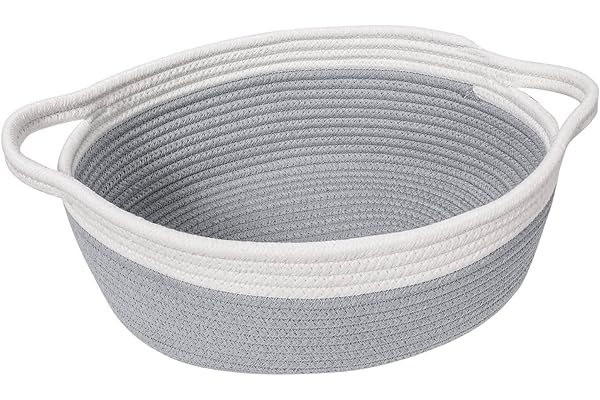 Goodpick Small Woven Basket Cute Gray Rope Basket Cotton Basket Baby Room Storage Basket Dog Toy Basket with Handles Empty Gift Basket for Shelf 12"x 8" x 5" Easter Basket Oval Candy Color Design