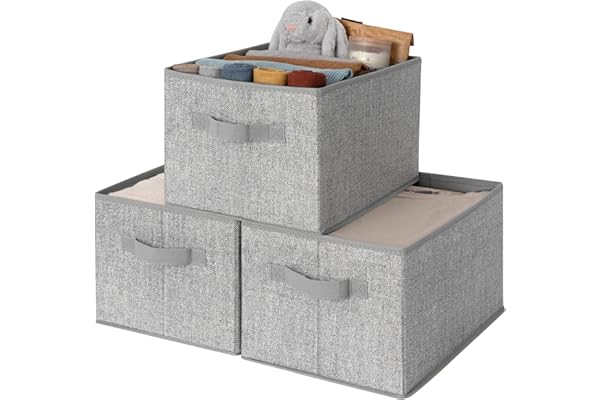 Closet Bin with Handles, Foldable Rectangle Storage Baskets, Fabric Containers Storage Boxes for Organizing Shelves Bedroom, Gray, Large, 3-Pack