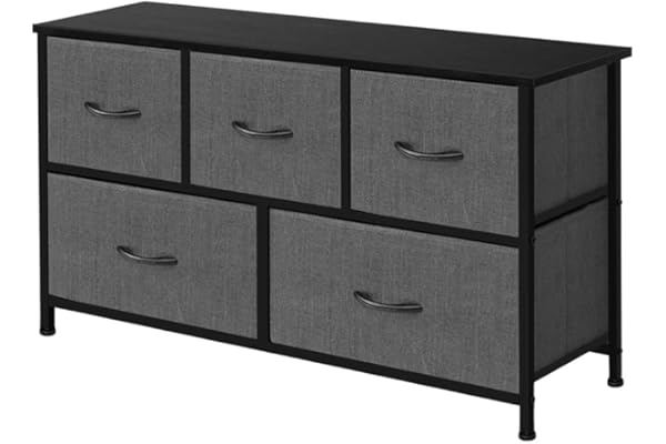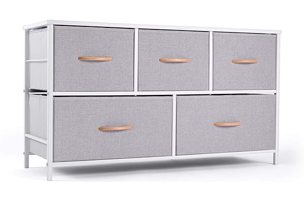 Sturdy Steel Frame, Wood Top, Easy Pull Fabric Bins, Wood Handles - Organizer Unit for Bedroom, Hallway, Entryway, Closets - 5 Drawers (Gray)