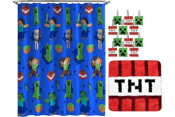 Includes Shower Curtain, 12 Hooks, & Non-Slip Bath Rug - Easy Care Fabric (Official Minecraft Product)