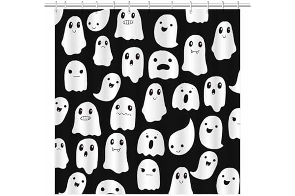 Spooky Cute Funny Cartoon Ghosts Icons Black and White Fabric Kids Boy Trick or Treat Bathroom Shower Curtain with 12 Hooks