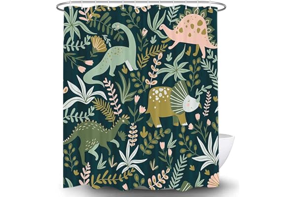 Cute Dino Colorful Kid Funny Cartoon Animal Boys Kids Bathroom Curtain, Waterproof Fabric Bathroom Accessories Sets with Hooks