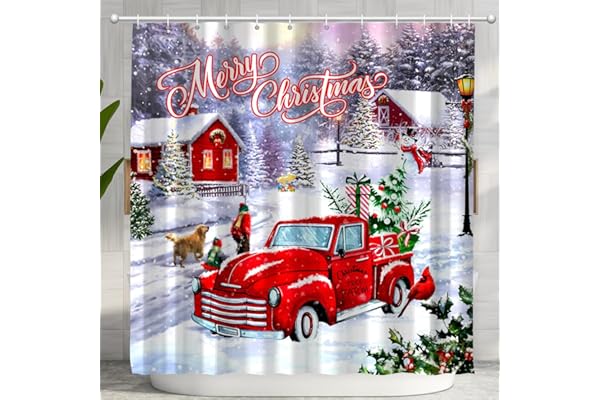Merry Christmas Shower Curtain Red Vintage Truck Tree Winter Snow Snowman Rustic Retro Farmhouse Bathroom Decor Sets 72 x 72 Inches