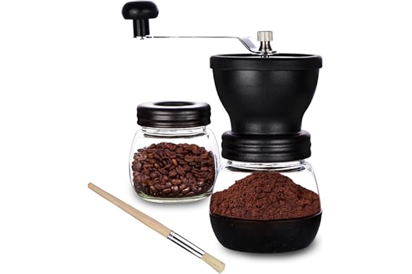 Hand Coffee Mill with Two Glass Jars(11oz each), Brush and Tablespoon Scoop