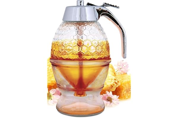 Maple Syrup Dispenser Glass - Beautiful Honey Comb Shaped Honey Pot - Honey Jar with Stand, Great Bee Decor