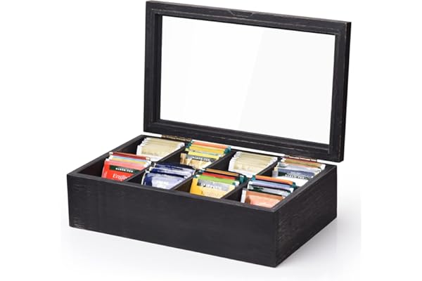 Alsonerbay Wooden Tea Box Tea Bag Holder Kitchen Storage Chest Box for Spice Pouches and Sugar Packets with 8 Compartments and Glass Window Weathered Black