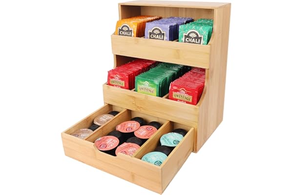 Bamboo Tea Bag Holder, Coffee Pod Holder, Bamboo tea&Coffee organizer 2 in 1 Set, 2 Tier Stackable Holder with 1 Storage Drawer, Tea Box for Tea Storage for Home, Office or Café