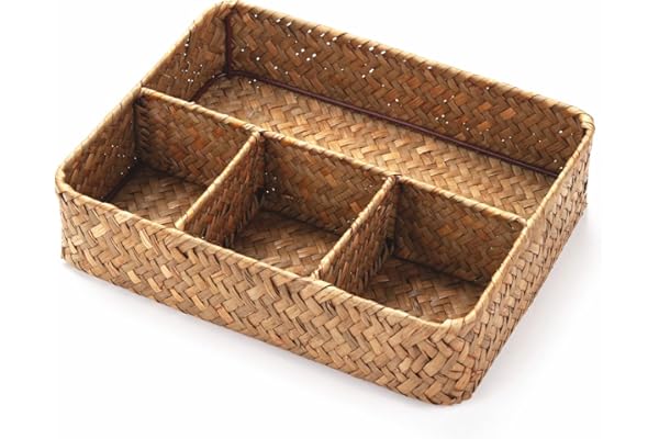 Coffee Station Condiment Organizer, Seagrass Storage Basket, Wicker Rattan Divided Basket Organizer for Drawer/Shelf/Countertop