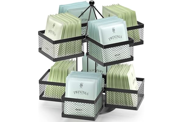 Tea Bag Storage Holder Spinning Carousel with 12 Compartments, Up to 140 Tea Bags Storage, Tea Bag Holder Black Powder Coated Stainless Steel