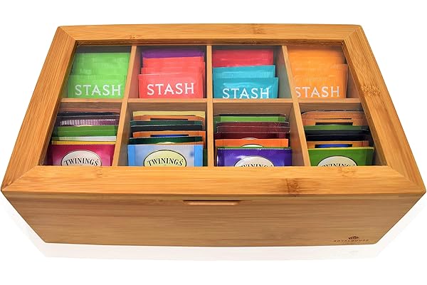 Natural Bamboo Tea Box Storage Organizer- 8 Compartments Tea Bag Holder with Clear Acrylic Window- Natural Wooden Finish Tea Storage Organizer