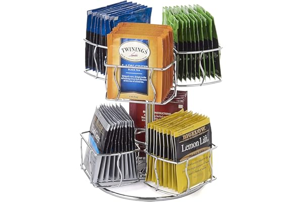 6 Compartments, Up to 60 Tea Bags Storage, Spins 360-Degrees, Lazy Susan Platform, Modern Chrome Design, Home or Office Kitchen Counter Organizer