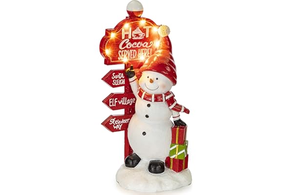 VP Home Christmas Snowman Decor Christmas Figurines Resin Snowman Lighted Decorations Indoor Hot Cocoa Signpost LED Holiday Light Up Snowman Indoor Festive Fiber Optic Decorations