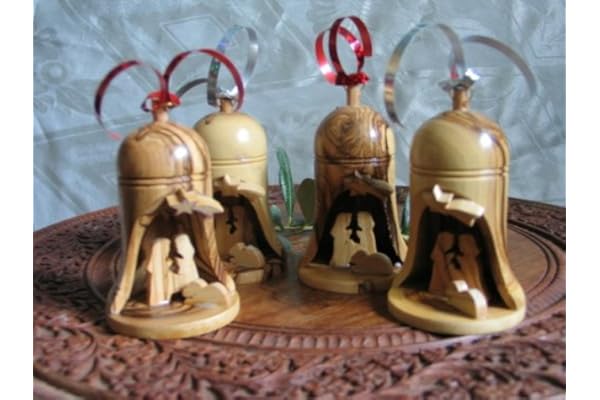 Holy Land Imports 4 Olive Wood Bell Christmas Ornaments from Bethlehem