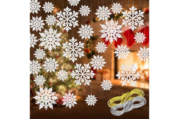 46 Pcs White Glitter Snowflake Ornaments Various Size Plastic Winter Snowflakes Ornaments Christmas Tree Decorations with Silver Rope for Winter Wonderland Christmas Tree Window Door Accessories