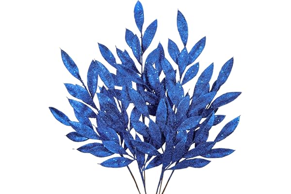 6Pcs Christmas Glitter Leaves Bay Leaves Spray 24" Artificial Blue Bay Leaf Picks Sprays Giltter Stems for Christmas Tree Ornaments DIY Xmas Wreath Garland Home Decor