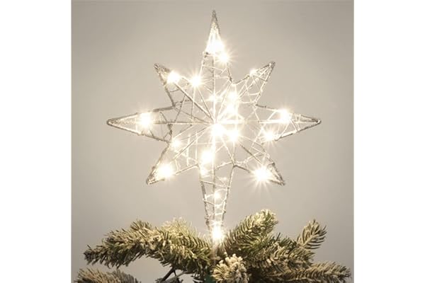 Lighted Bethlehem Star Tree Topper Christmas Decorations with 20 Wired LED Lights for Xmas Tree, Silver Glittered