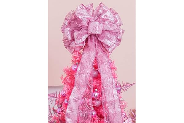 Christmas Tree Topper 11x27 Inches Large Decorative Bow with Streamer Wired Edgefor Xmas Decorations Home Decor with Packaging Double Slide (Pink)